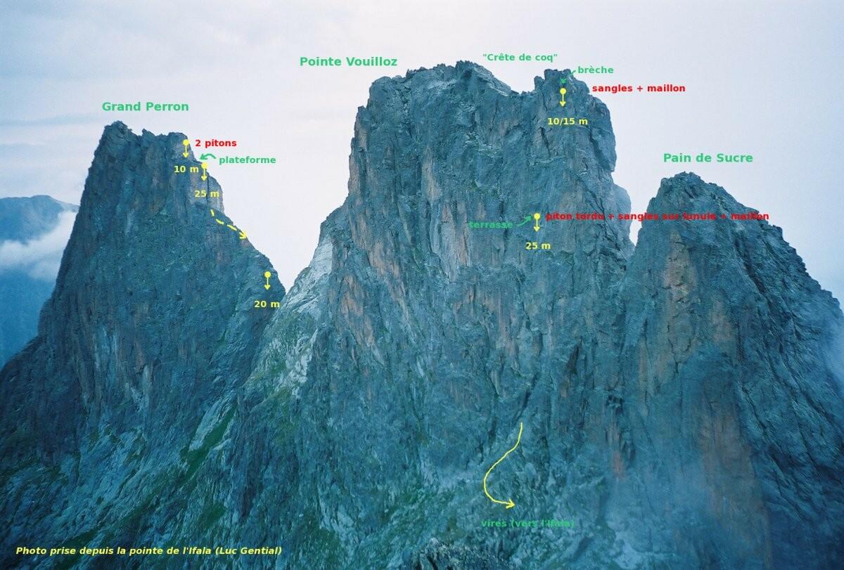 Ce sera la traversée des Perrons, côté AD ! Arrivés au lac d'Emosson en Suisse où il paraît que des traces de dinosaures sont fossilisées. Pas le temps pour la paléontologie, nous cramponons et entamons une longue montée dans un couloir très raide qui nous demande de nous encorder. Au sortir d'une cheminée la vue se dégage enfin. Un magnifique panorama nous fait face, au loin plusieurs 4000 avec des noms prestigieux. Après une petite pause pour nous remettre de nos efforts, nous démarrons la traversée corde tendue. De superbes passages en arête, très aériens et bien protégés par des becquets ou bien des friends judicieusement placés dans les fissures. Nous progressons bien ! Arrivés à la première pointe, deux rappels s'en suivent pour se retrouver à un petit col. Delà nous attaquons trois longueurs avec un pas en 4C, on entendra Maxime crier : « Mais que c'est beau, que c'est beau !! ». Nous atteignons le sommet , une croix en bois s'y trouve, rafistolée d'une cordelette, cela nous suffit à immortaliser l'instant.